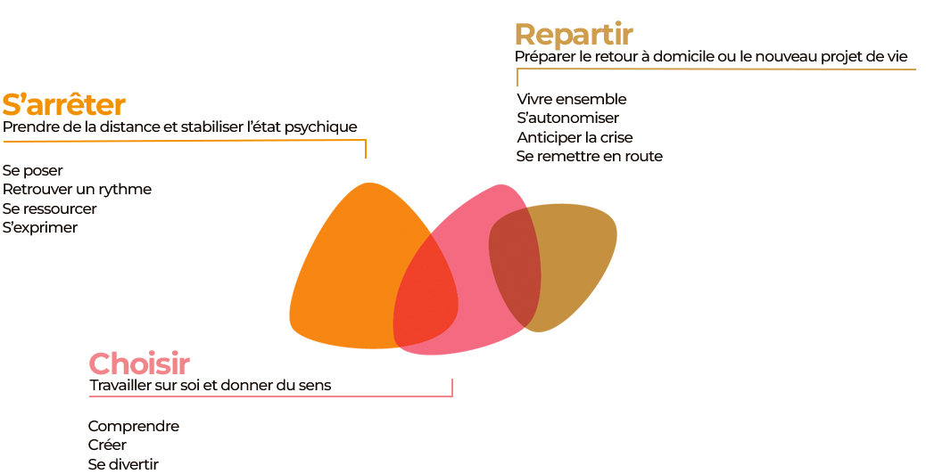 Basé sur un concept de soins favorisant le rétablissement, le parcours thérapeutique se déroule en trois étapes: S’arrêter – Choisir – Repartir. Ce cheminement vise à stabiliser l’état psychique, restaurer une image de soi positive et préparer chaque personne à une vie plus autonome, majoritairement à domicile.